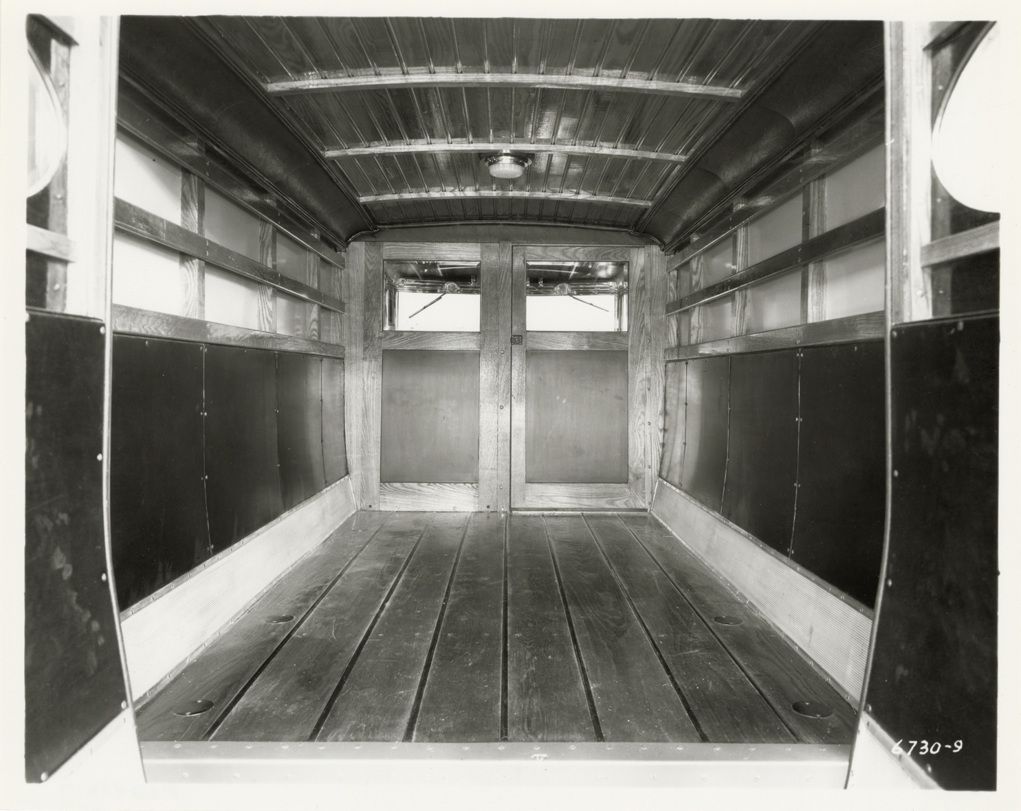 View of the interior of a 1929 General Motors Model 0-10 town car. Handwritten on back: "GM truck. Model 0-10 town car panel."