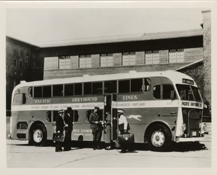 View of passengers boarding a Pacific Greyhound bus. "Pacific Greyhound Lines" is painted on side of bus. Typed on back: "Pickwick Nite Coach. Designed by Dwight Austin. Built about 1933." Handwritten on back: "Greyhound Pac Hound #801."