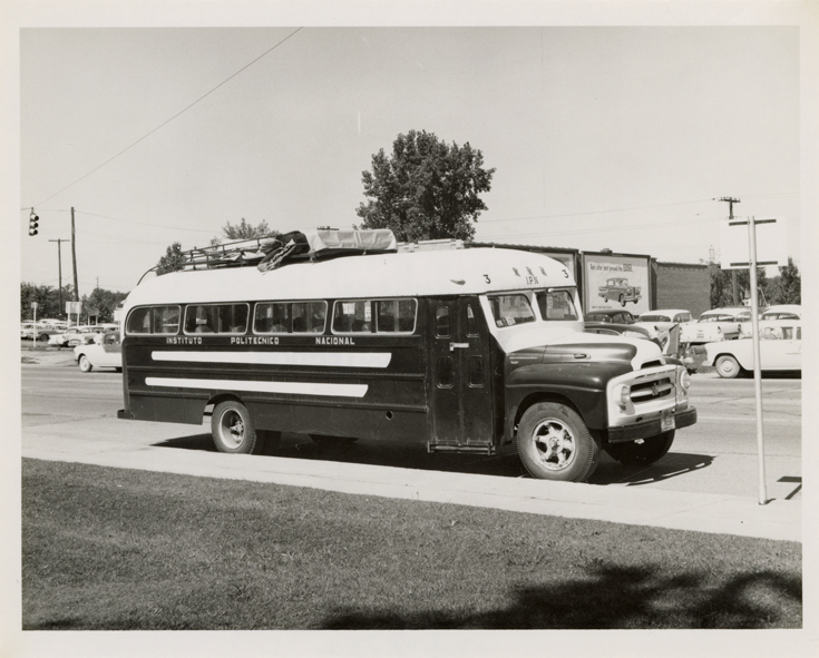 View of an International Harvester bus for the Instituto Politecnico Nacional. Stamped on back: "Oct 1957." Handwritten on back: "International Harvester."