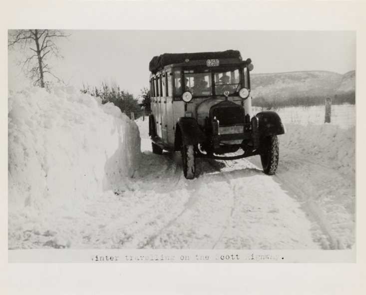 View of an International Transit Co. bus traveling on snow-covered Scott Highway. Printed on front: "Winter travelling on the Scott Highway." Handwritten on back: "International Transit."