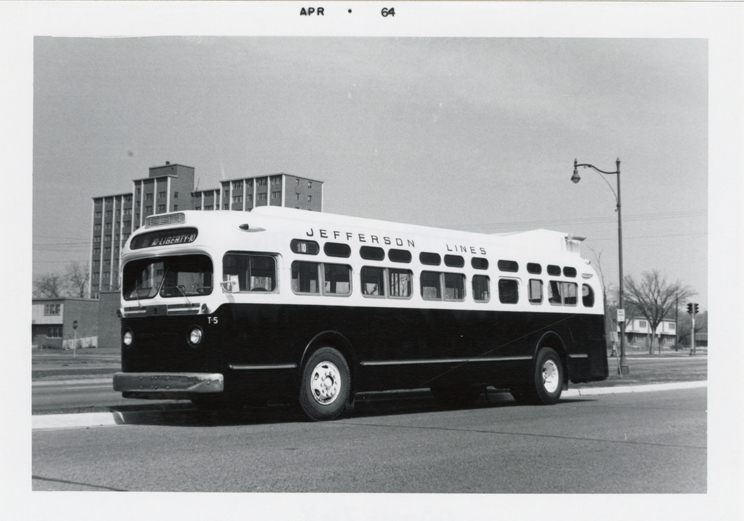 View of a Jefferson Transportation Company bus. Printed on front: "Apr 64." Handwritten on back: "GM TDH 4509. Jefferson Transp. Co., Minneapolis, Minn."