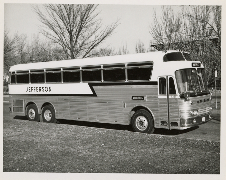 View of a Jefferson Transportation Company bus. Handwritten on back: "Jefferson Transportation."