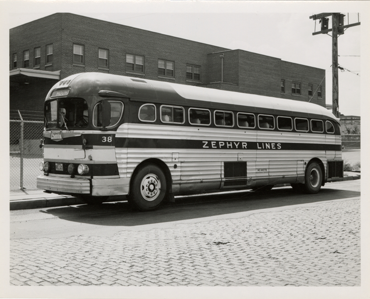 View of a Jefferson Transportation Company bus for the Zephyr Lines. Handwritten on back: "Jefferson Transportation."