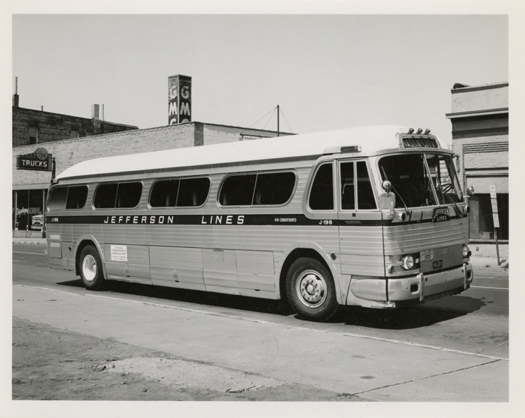 View of a Jefferson Transportation Company bus. Stamped on back: "Aug 16 1964." Handwritten on back: "Jefferson Transportation."