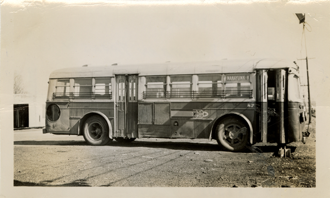 View of a Mack bus for the Philadelphia Suburban Transportation Co. Handwritten on back: "Mack, Philadelphia Suburban Trans'n. Co. #87 Mack built. Victory Ave. Garage, Upper Darby, Pa."