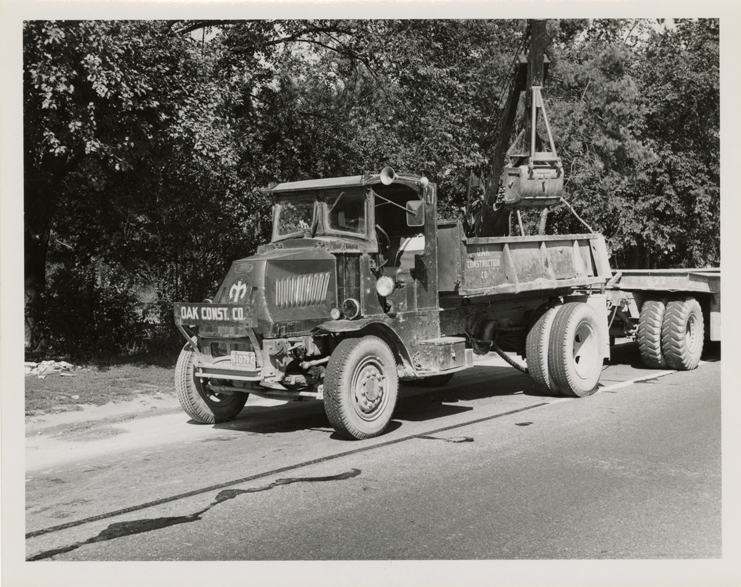 View of a Mack truck for the Oak Construction Co. Stamped on back: "Aug 60." Handwritten on back: "Mack. Cad. V-8 engine."
