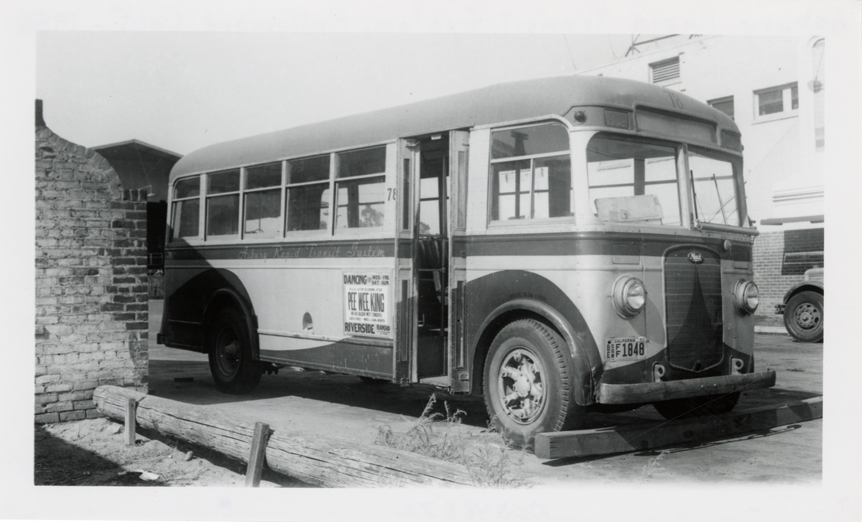 View of a Mack bus for the Asbury Rapid Transit System. Handwritten on back: "Mack. Asbury Rapid Transit System, Hollywood, Calif., 1956."