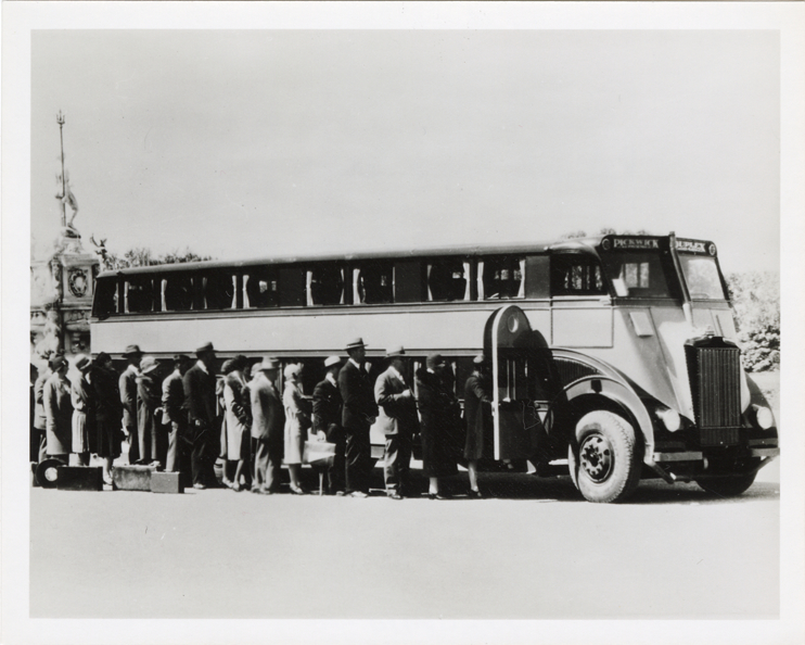View of passengers boarding a Pickwick Stages Duplex bus. Handwritten on back: "Pickwick Duplex demo."