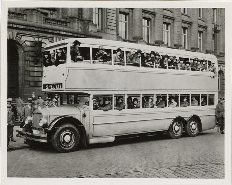 View of passengers posing on a Safeway Six Wheel double-decker bus. Handwritten on back: "Safeway Six Wheel."