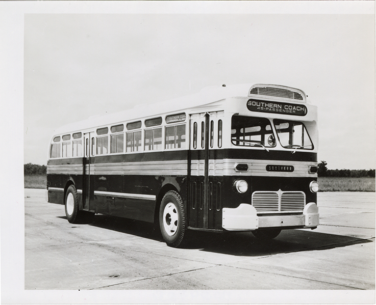 View of a Southern Coach bus. Handwritten on back: "Southern Coach."