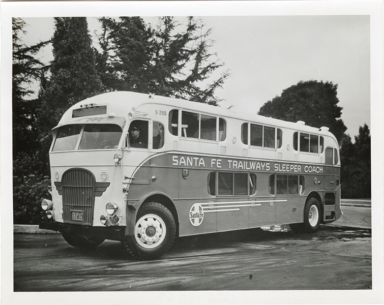 View of a Santa Fe Trailways Sleeper Coach bus. Handwritten on back: "Trailways."