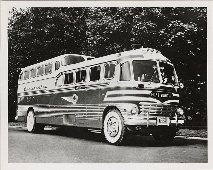 View of a Continental Trailways bus. Handwritten on back: "Trailways Continental deck & 1/2."