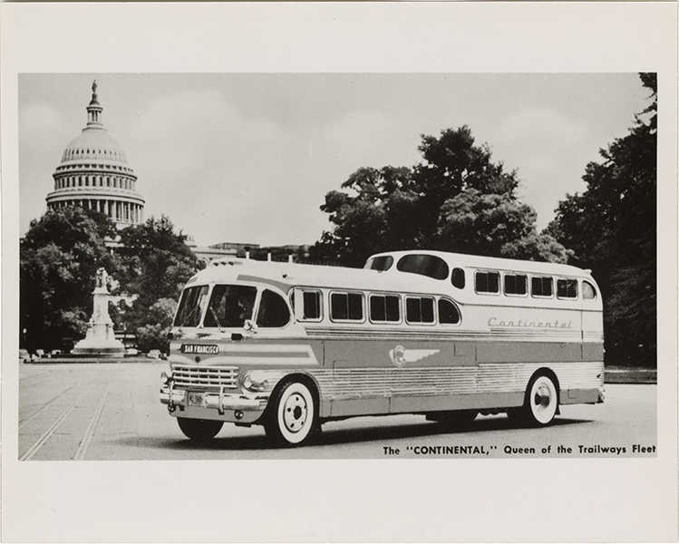 View of a Continental Trailways bus. U.S. Capitol building in background. Handwritten on back: "Trailways Continental deck & 1/2."