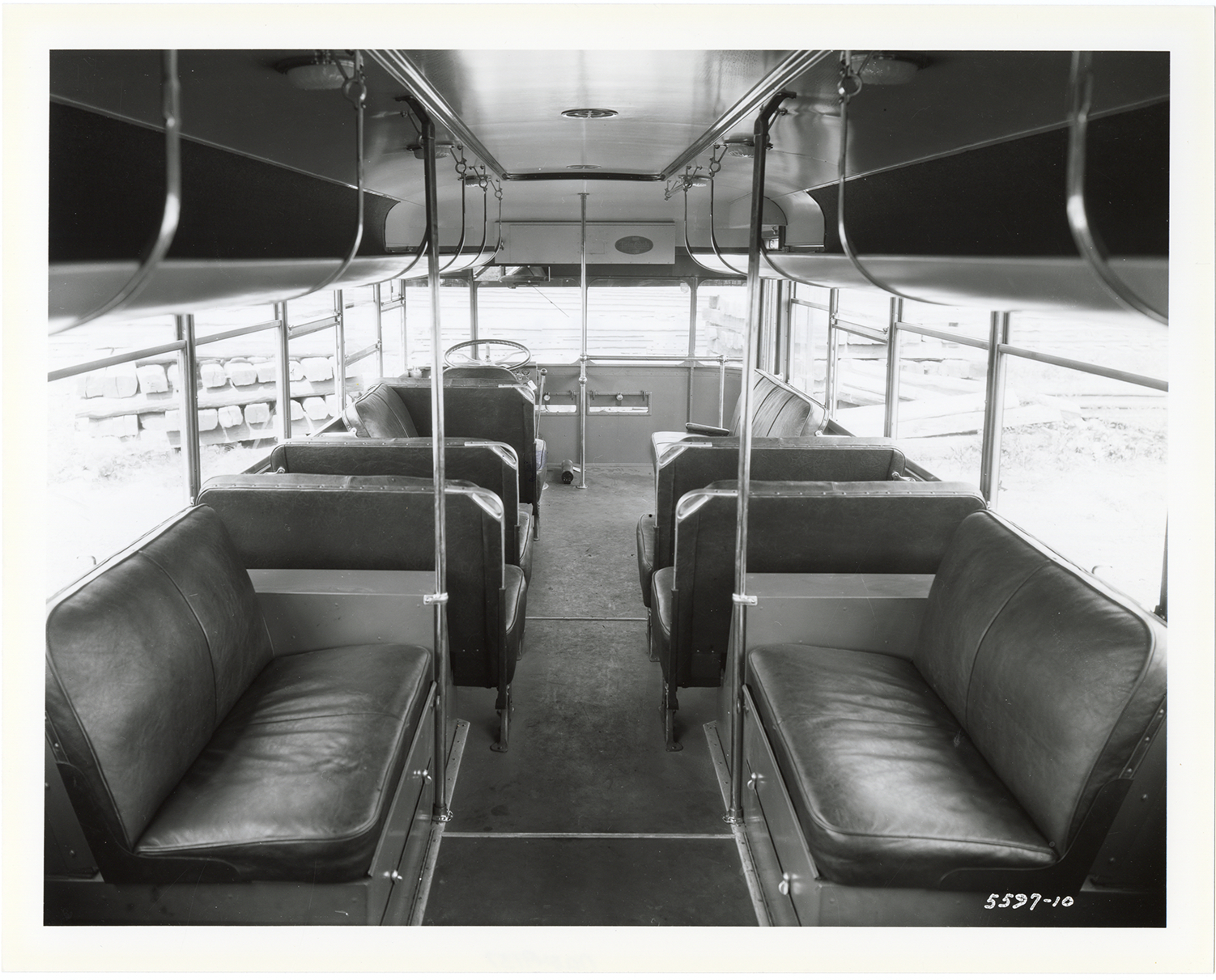 Interior view of a Twin Coach bus, showing seats. Handwritten on back: "Twin Coach, Model 40."