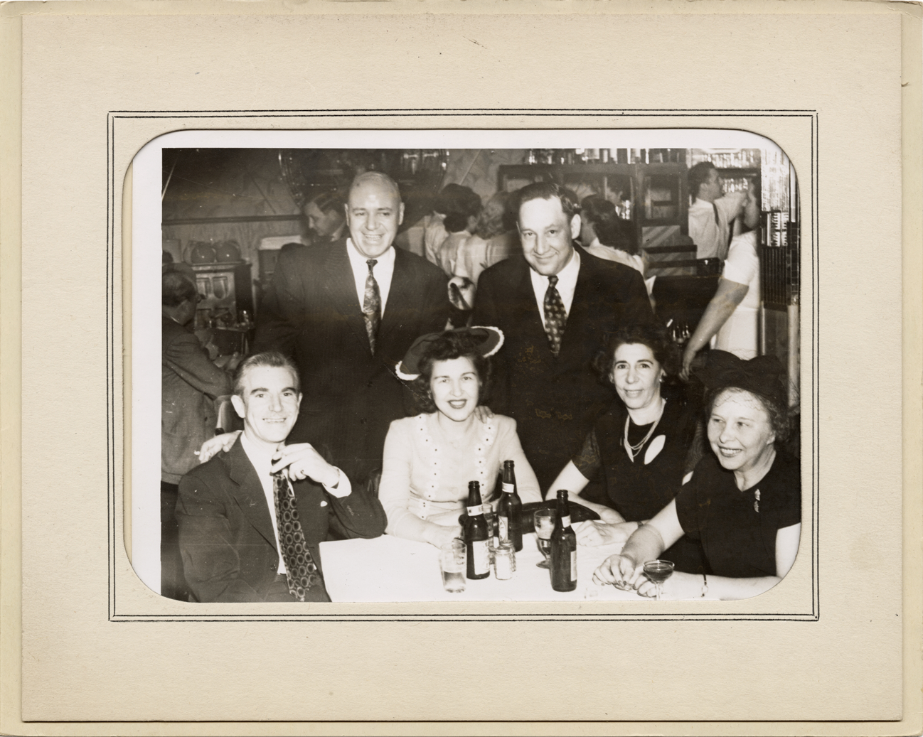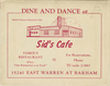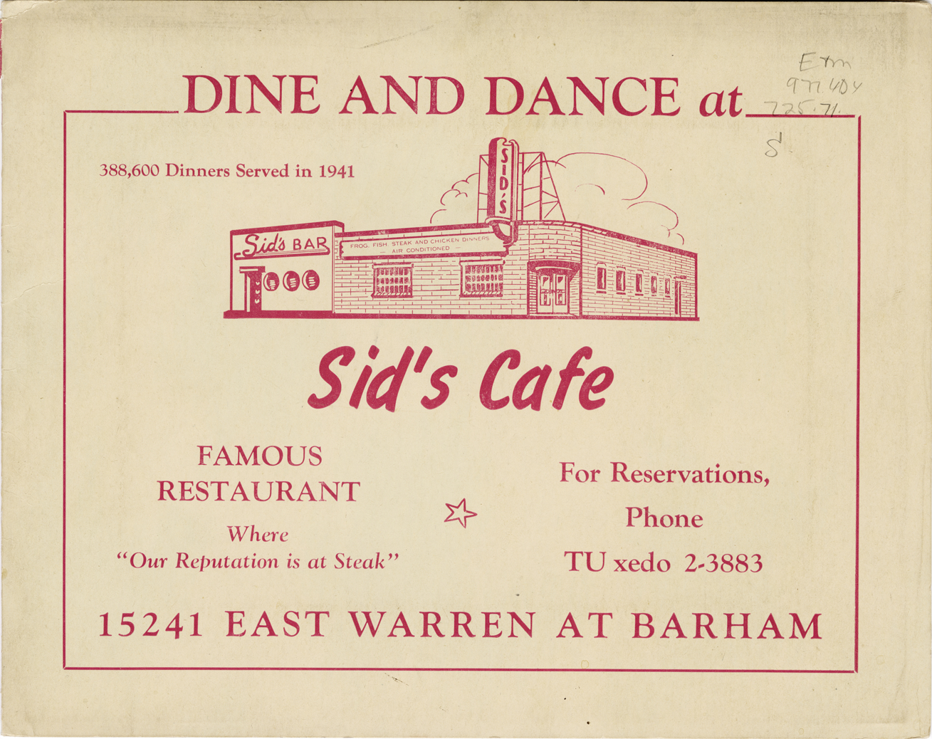 Souvenir photograph folder from Sid's Cafe and Sid's Bar located at E. Warren and Barham in Detroit. Front cover depicts the exterior of the building. Printed on front: "Dine and dance at Sid's Cafe. 388,600 dinners served in 1941. Famous restaurant. Where our reputation is at steak. For reservations, phone Tuxedo 2-3883. 15241 East Warren at Barham." Photograph attached inside folder depicts three men and three women with drinks sitting at table inside Sid's Cafe.