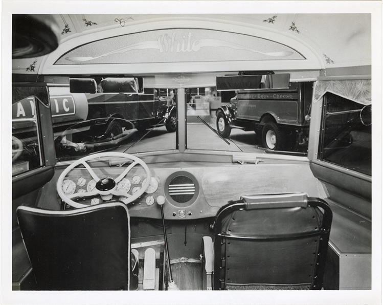 Interior view of a 1936 White Dream Coach bus, showing steering wheel, driver's seat and windshield. Handwritten on back: "White Dream Coach interior, 1936."
