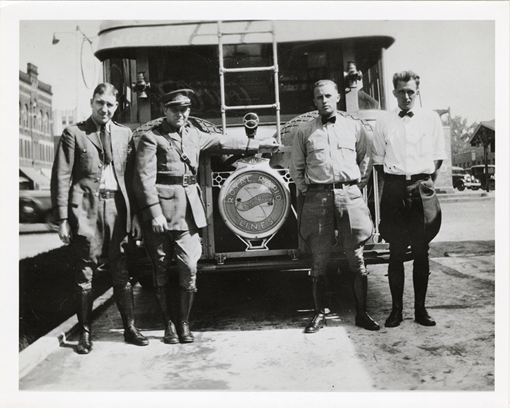 View of men posing with a 1929 Will bus for the Royal Rapid Lines. Handwritten on back: "Will, 1929. Royal Rapid Lines."