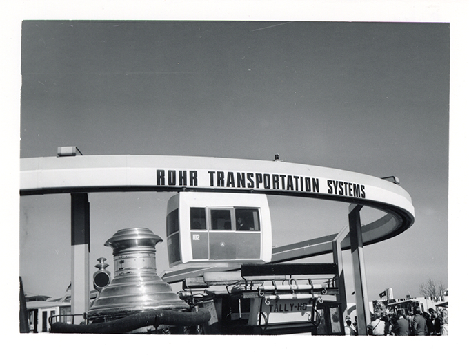 View of the Rohr Transportation Systems monorail at Transpo '72. Handwritten on back: "Rohr monocab, Transpo 72, 5-27-72."