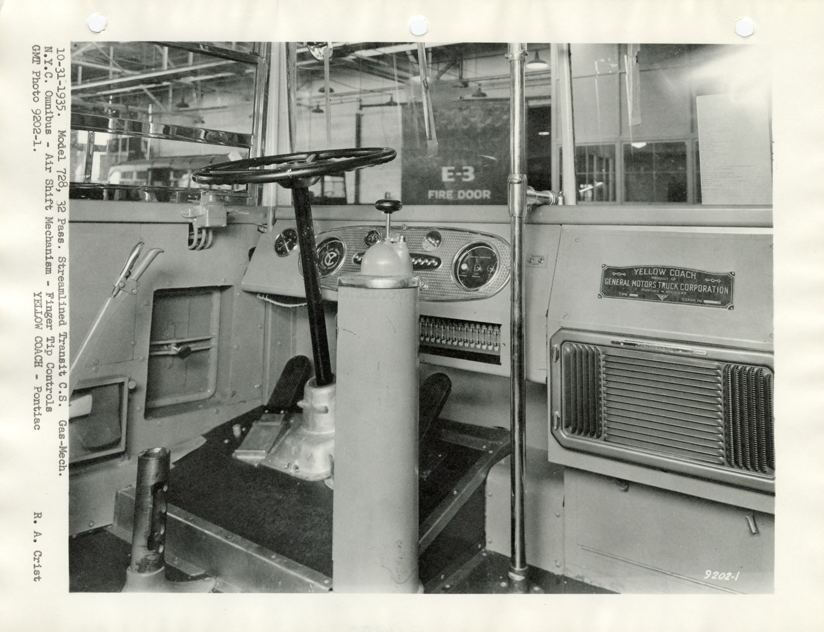 Interior view of a Yellow Truck and Coach bus, showing steering column and instrument panel. Typed on front: "10-31-1935. Model 728, 32 pass. Streamlined transit c.s. Gas-Mech. N.Y.C. omnibus. Air shift mechanism. Finger tip controls. GMT photo 9202-1. Yellow Coach, Pontiac. R.A. Crist."