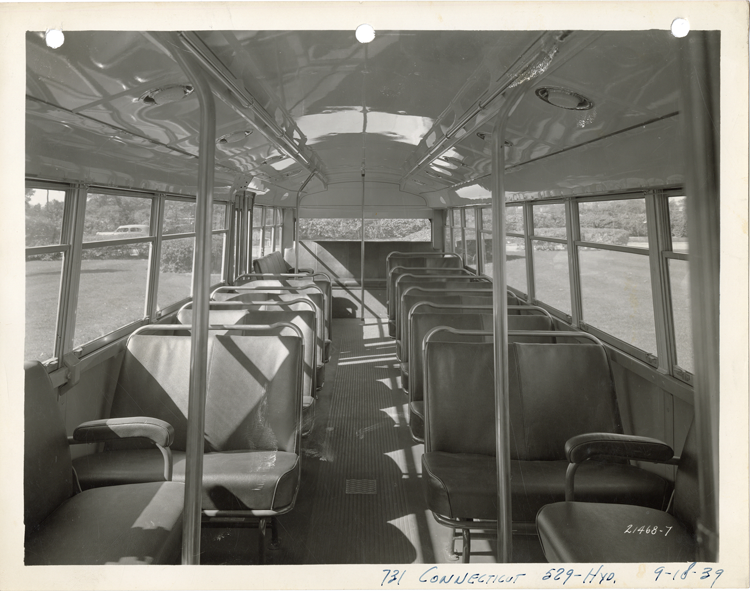 Interior view of a Yellow Truck and Coach bus, Model 731, showing seats. Handwritten on front: "731, Connecticut, 529 hyd., 9-18-39." Handwritten on back: "Yellow Truck & Coach. Model 731."