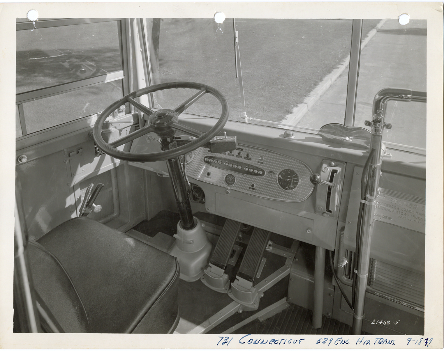 Interior view of a Yellow Truck and Coach bus, Model 731, showing driver's seat, instrument panel and steering wheel. Handwritten on front: "731 Connecticut, 529 eng., hyd. trans., 9-18-39." Handwritten on back: "Yellow Truck & Coach. Model 731."