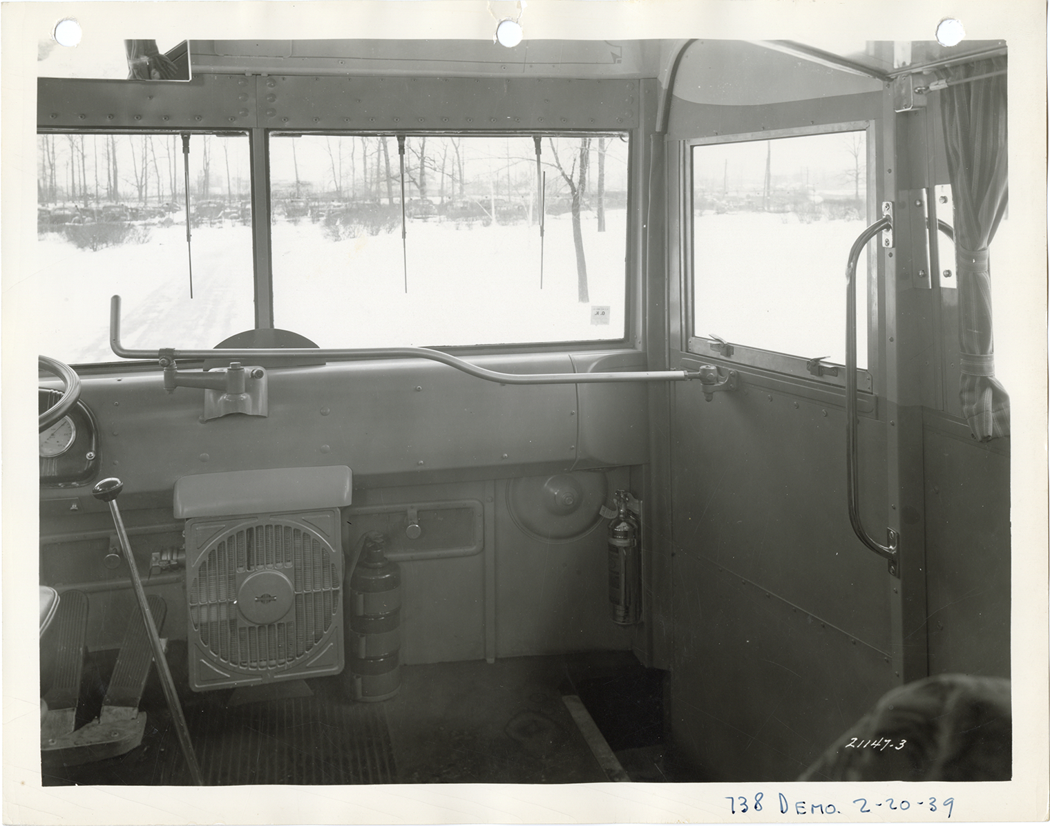 Interior view of the front of a Yellow Truck and Coach bus, Model 738, showing windshield and entrance door. Handwritten on front: "738 demo, 2-20-39." Handwritten on back: "Yellow Truck & Coach. Model 738."