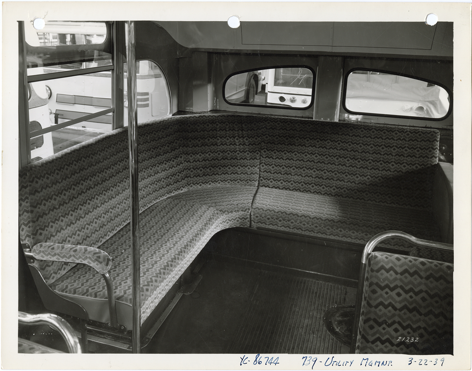 Interior view of a Yellow Truck and Coach bus, Model 739, showing seats. Handwritten on front: "YC-86744, 739, Utility Mgmnt., 3-22-39." Handwritten on back: "Yellow Truck & Coach. Model 739."