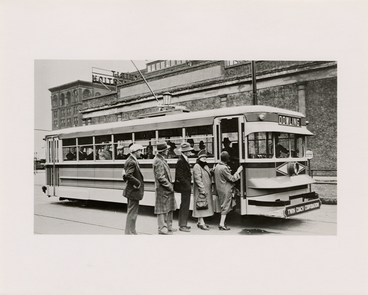 View of passengers boarding a Fageol Twin Coach streetcar. Handwritten on back: "Fageol Twin Coach streetcar."