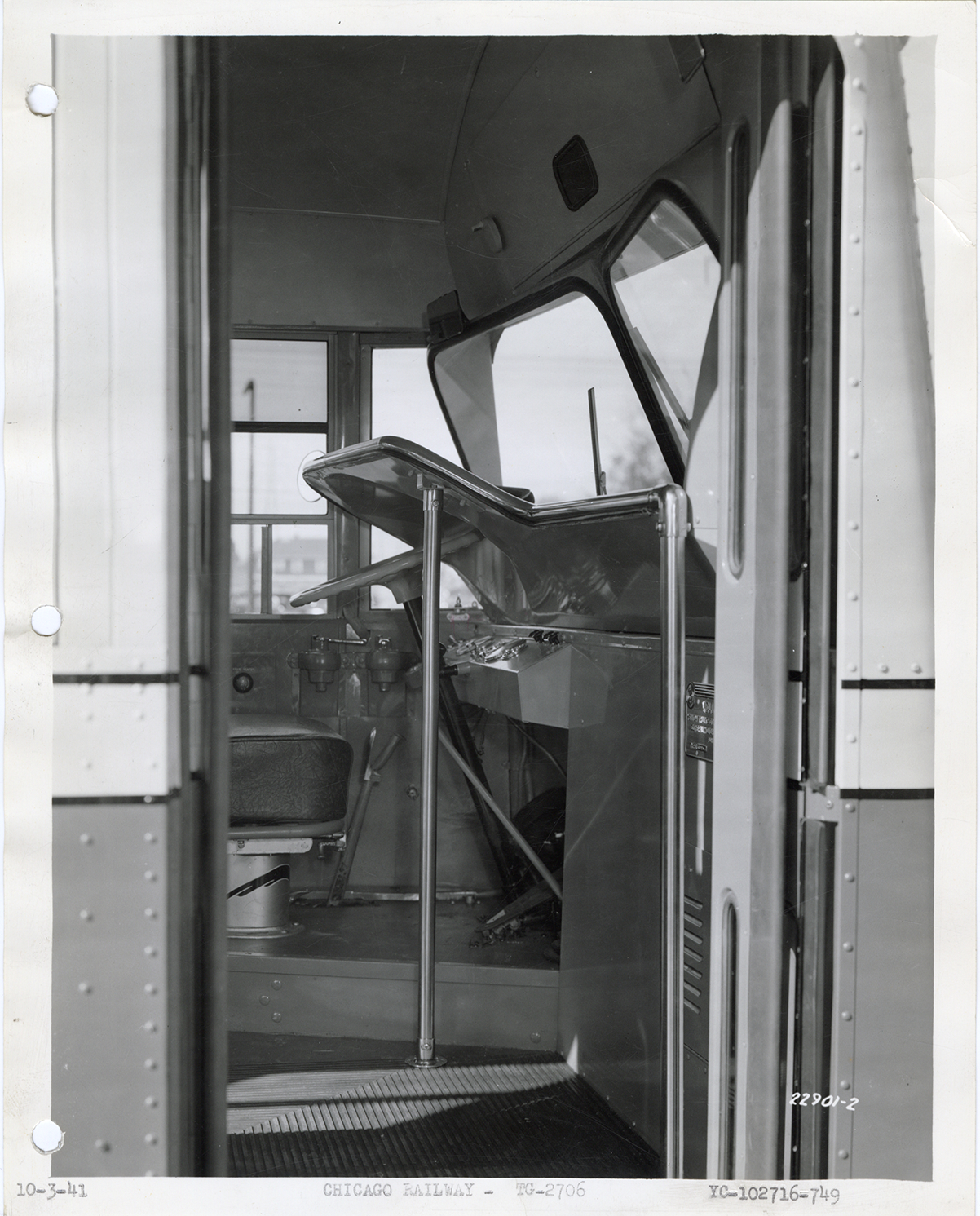 Interior view of a Yellow Truck and Coach bus, Model 2706, for the Chicago Railway, showing driver's seat and steering wheel. Typed on front: "10-3-41, Chicago Railway, TG-2706, YC-102716-749." Handwritten on back: "Yellow Truck & Coach. Model 2706."