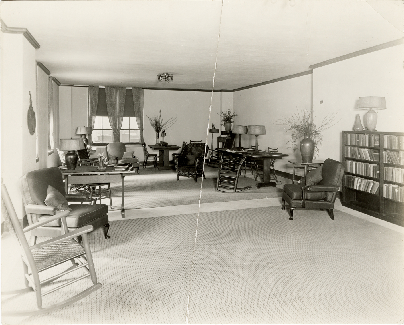 View of the library in the Women's City Club of Detroit building. Room is furnished with chairs, tables, lamps and bookcase. Stamped on back: "Manning Bros., commercial photographers. 504-505 Lincoln Building. Corner State and Park Sts., Detroit, Mich." Handwritten on back: "Library, 4th floor."
