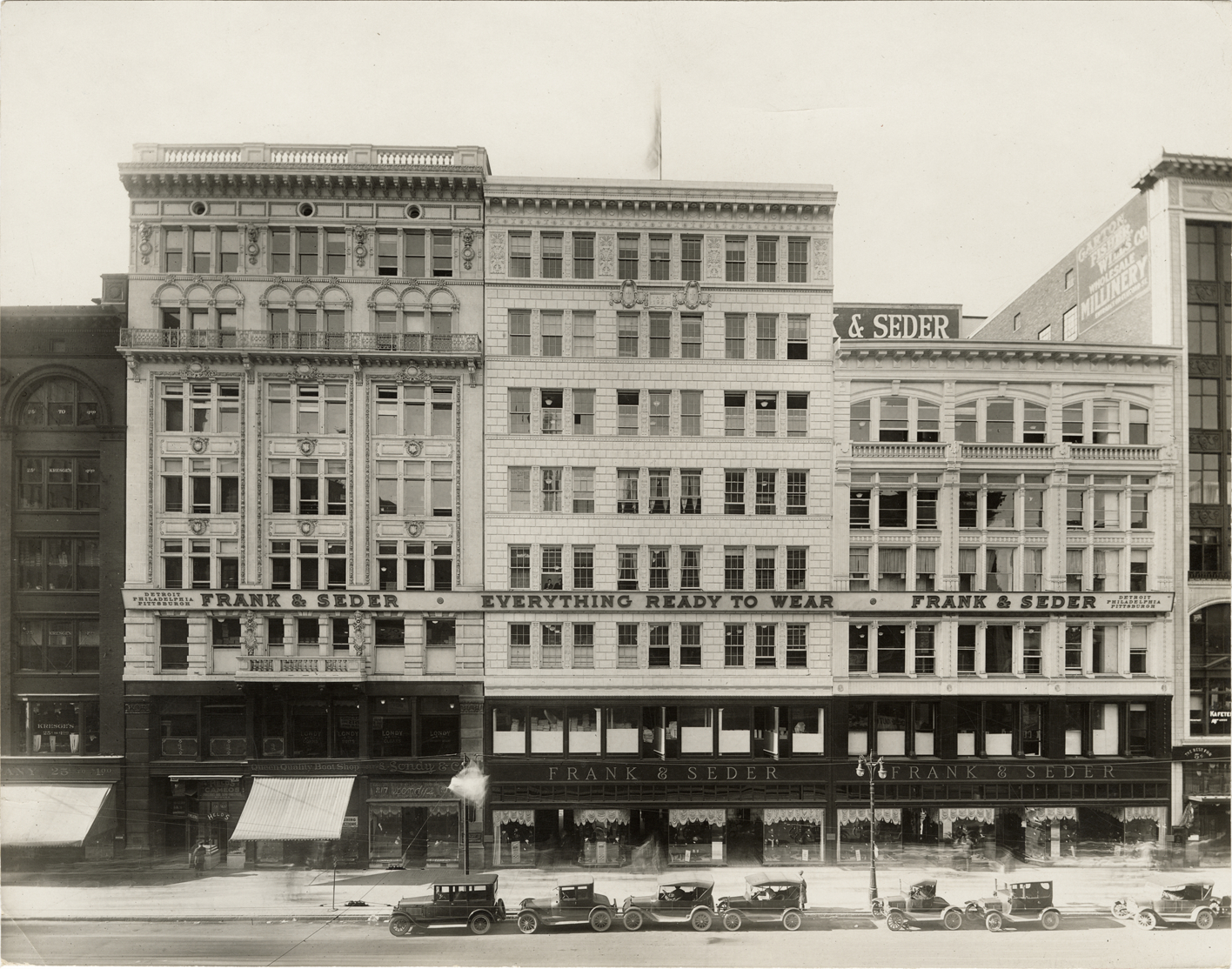 View of the Frank & Seder department store on Woodward Ave. Cars are parked in front of building. Handwritten on back: "Woodward Avenue (west side) between Grand River & State St."