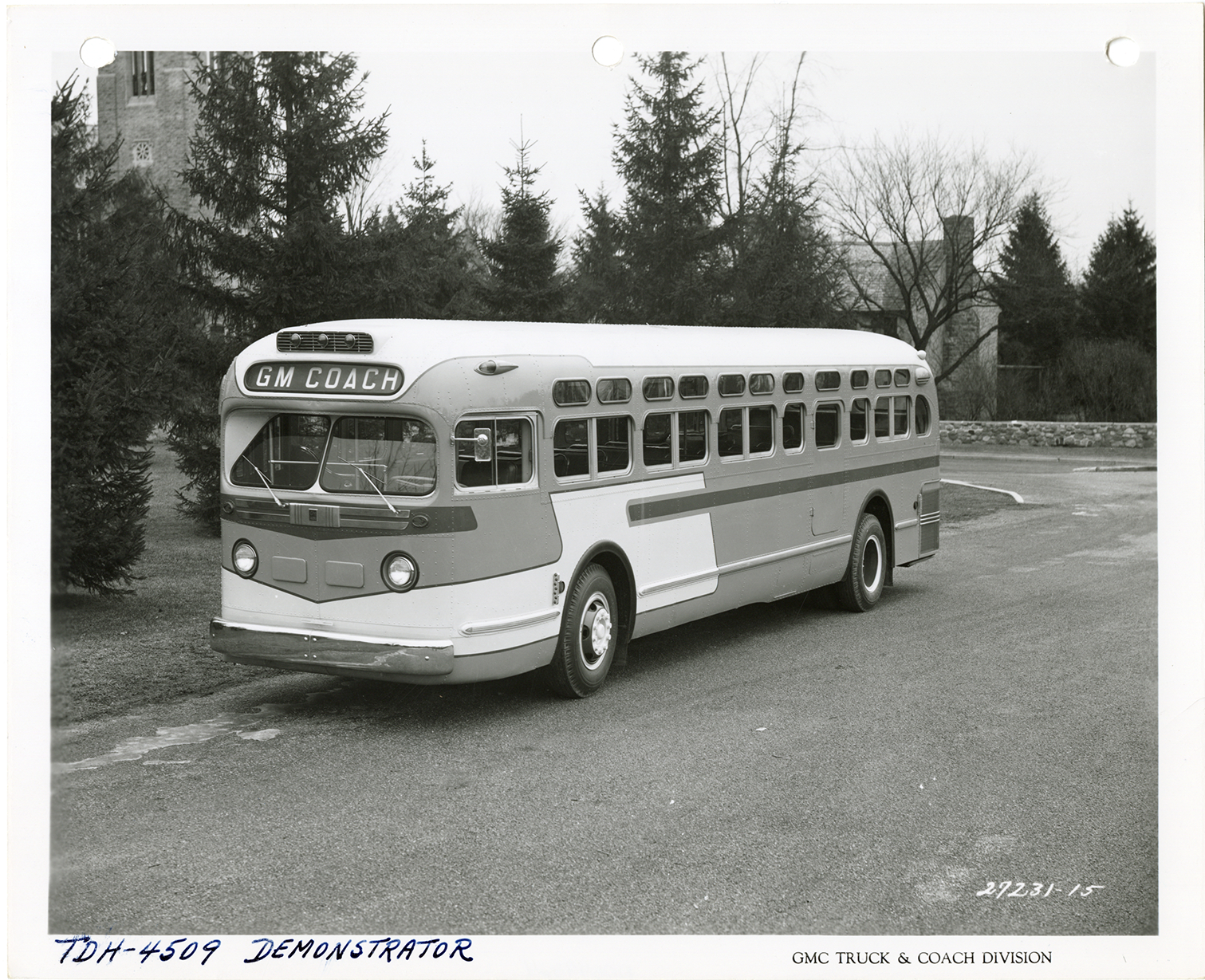 View of a GMC Truck & Coach bus, Model TDH-4509. Printed on front: "GMC Truck & Coach Division." Handwritten on front: "TDH-4509, demonstrator." Handwritten on back: "GMC Truck & Coach, Model TDH-4509."