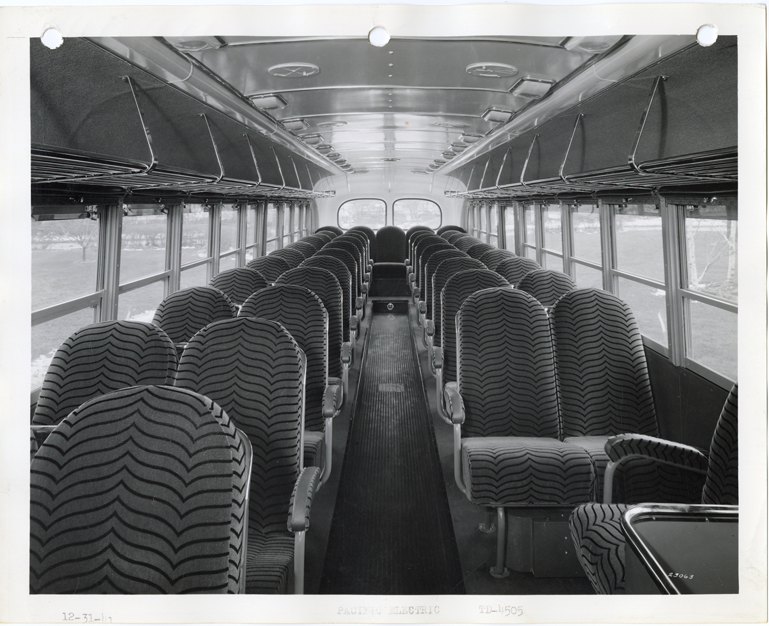 Interior view of a Yellow Truck and Coach bus, Model TD-4505, for the Pacific Electric Railway Company, showing seats. Typed on front: "12-31-41, Pacific Electric, TD-4505." Handwritten on back: "Yellow Truck & Coach, Model 4505."