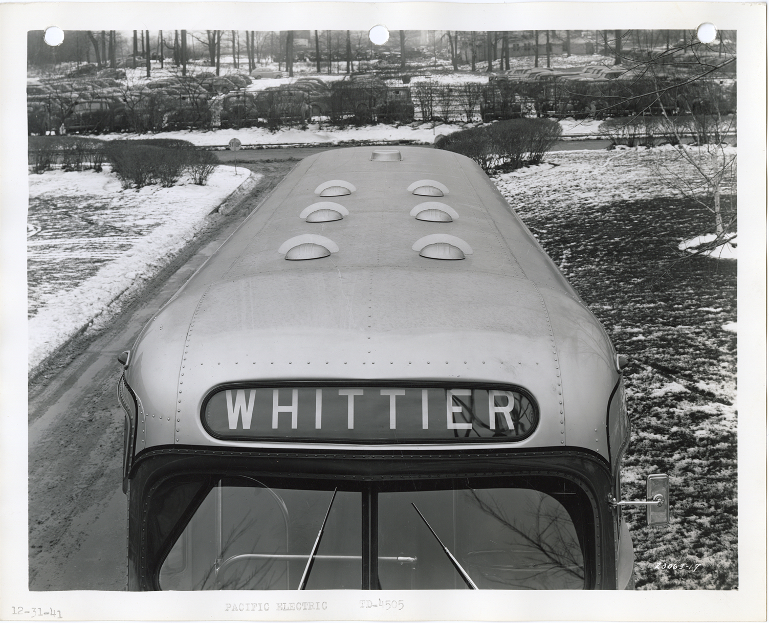 View of the roof of a Yellow Truck and Coach bus, Model TD-4505, for the Pacific Electric Railway Company. Typed on front: "12-31-41, Pacific Electric, TD-4505." Handwritten on back: "Yellow Truck & Coach, Model 4505."