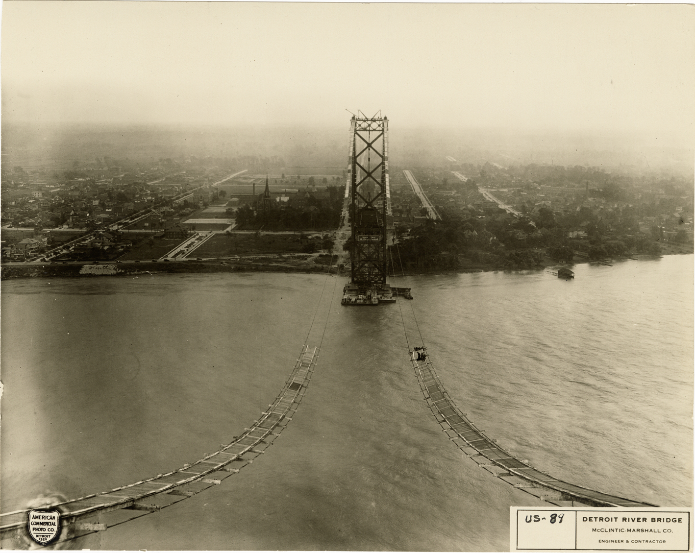 Bird's-eye view of the Ambassador Bridge during construction. Printed on front: "American Commercial Photo Co., Detroit 1928. US-89, Detroit River Bridge, McClintic-Marshall Co., engineer & contractor."