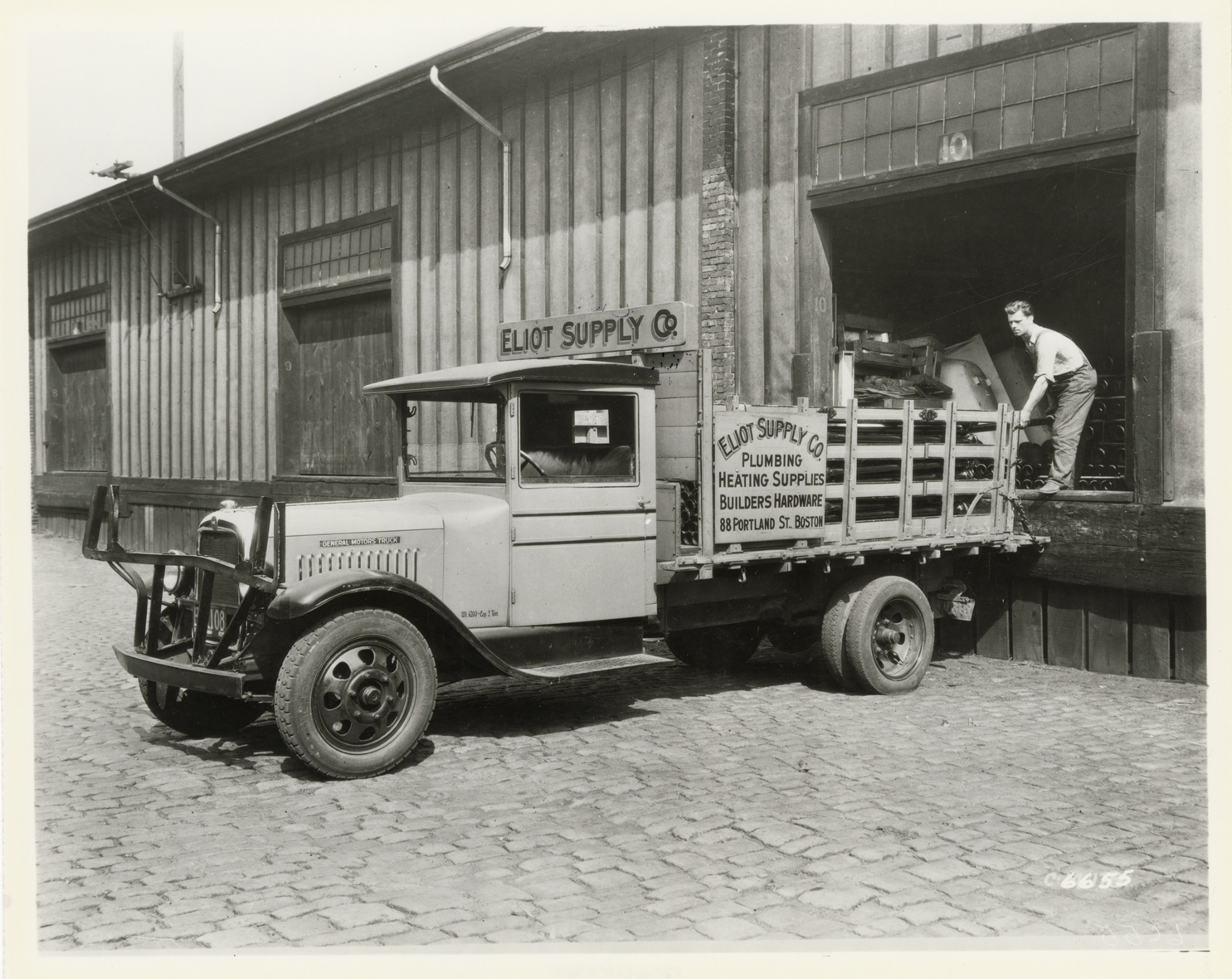 View of a worker loading a GMC truck for the Eliot Supply Co. Painted on side of truck: "Eliot Supply Co. Plumbing, heating supplies, builders, hardware. 88 Portland St., Boston." Handwritten on back: "GMC."