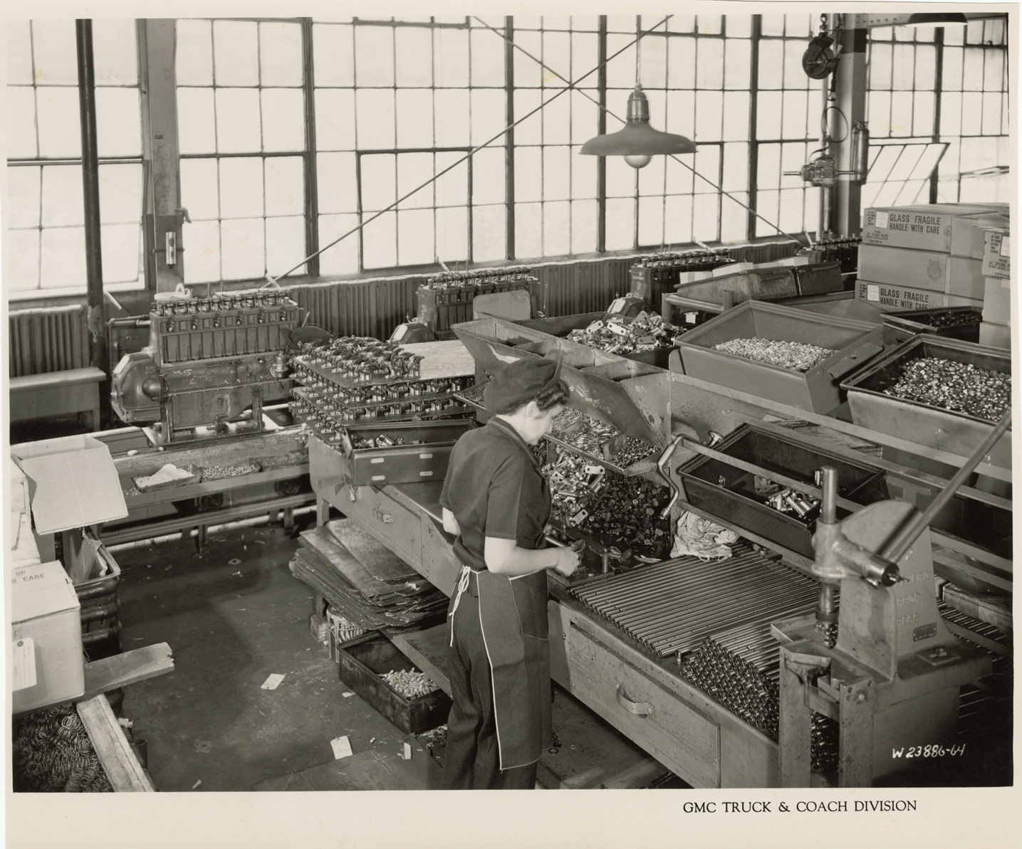 View of a woman worker with bins of parts at the GMC Truck & Coach plant. Printed on front: "GMC Truck & Coach Division." Handwritten on back: "Factories--GMC, ca. 1943."