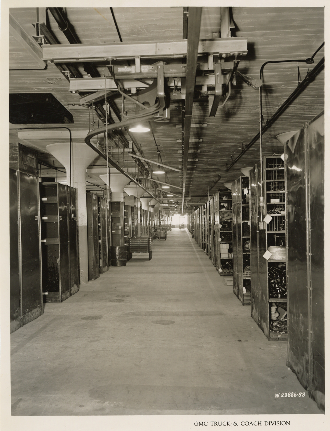 View down center aisle of stock room at Plant 4, Service Dept., Bldg. 20, Operations Civilian and Military, GMC Truck & Coach plant. Printed on front: "GMC Truck & Coach Division." Handwritten on back: "Plant 4, Service Dept., Bldg. 20, Operations Civilian and Military. Center aisle thru service stock room, 2nd floor. Factories--GMC, ca. 1943."