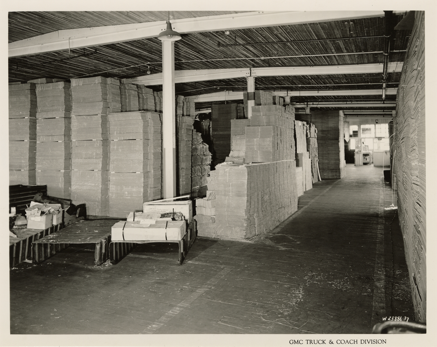 View of unassembled paper cartons stacked on floor, Plant 4, Service and Maintenance, Bldg. 23, GMC Truck & Coach plant. Printed on front: "GMC Truck & Coach Division." Handwritten on back: "Plant 4, Service and Maintenance, Bldg. 23, Storage of cartons for Bldg. 20, Operations of Service, 2nd floor. Factories--GMC, ca. 1943."