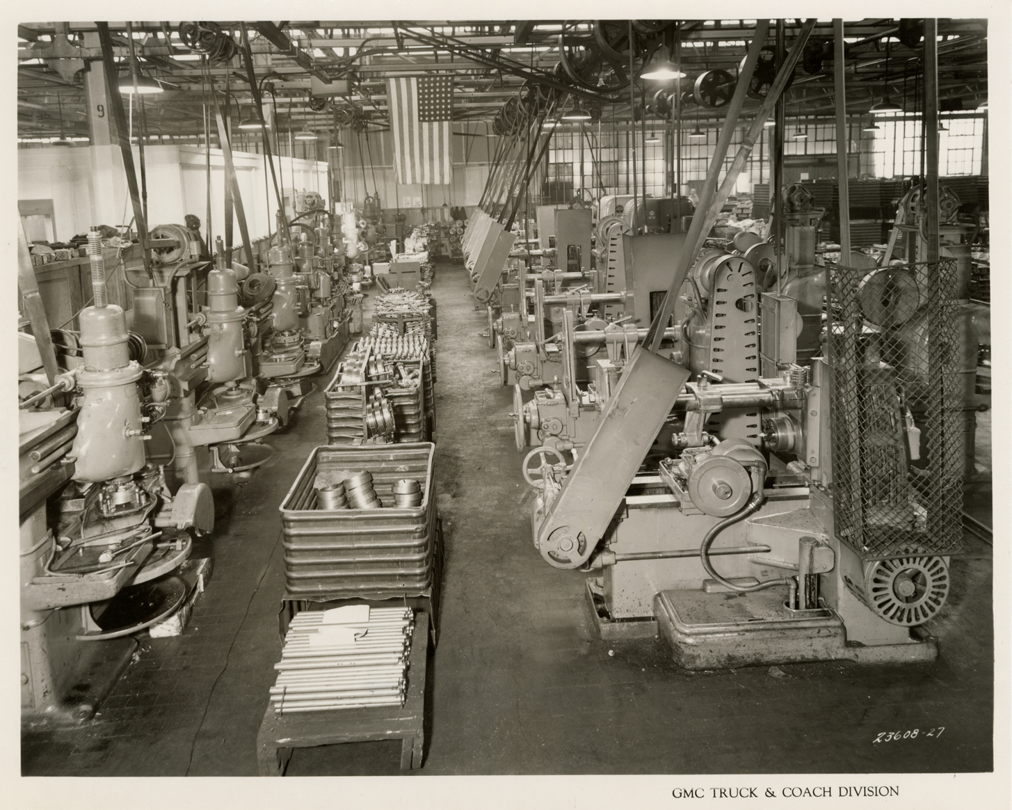 View of the Gear Cutting Dept. at Plant 1, GMC Truck & Coach plant. Printed on front: "GMC Truck & Coach Division." Handwritten on back: "Plant 1. Machine shop & Heat Treat Depts. 2 & 4, Bldg. 12. Dept. 2, Gear Cutting Dept., south end of line looking north. Factories--GMC, ca. 1943."