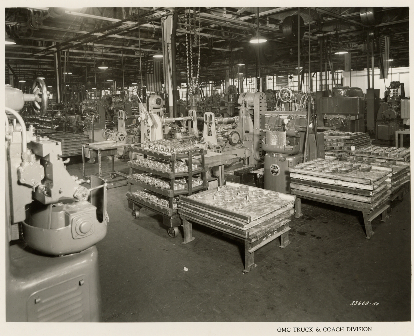 View of the Gear Cutting Dept. at Plant 1, GMC Truck & Coach plant. Printed on front: "GMC Truck & Coach Division." Handwritten on back: "Plant 1. Machine shop & Heat Treat Depts. 2 & 4, Bldg. 12. Dept. 2, Gear Lapping Dept., north end of line looking southwest. Factories--GMC, ca. 1943."