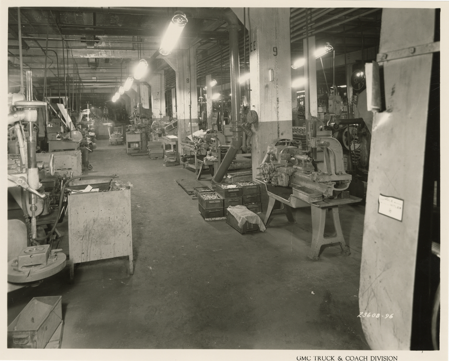 View of the stock aisle in Buick machine shop at Plant 1, GMC Truck & Coach plant. Printed on front: "GMC Truck & Coach Division." Handwritten on back: "Plant 1, Dept. 6. Buick machine shop. In basement of Bldg. 4. Misc. machining, stock aisle. Factories--GMC, ca. 1943."