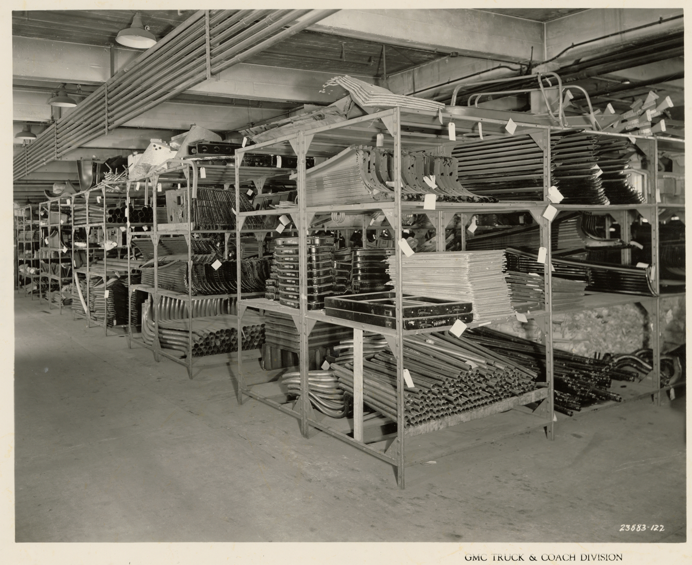 View of the Service Division stockroom at Plant 1, GMC Truck & Coach plant. Printed on front: "GMC Truck & Coach Division." Handwritten on back: "Plant 1, Service Division, 3rd fl. of main bldg. #5 Service stores. Odd shaped large rack material. Factories--GMC, ca. 1943."