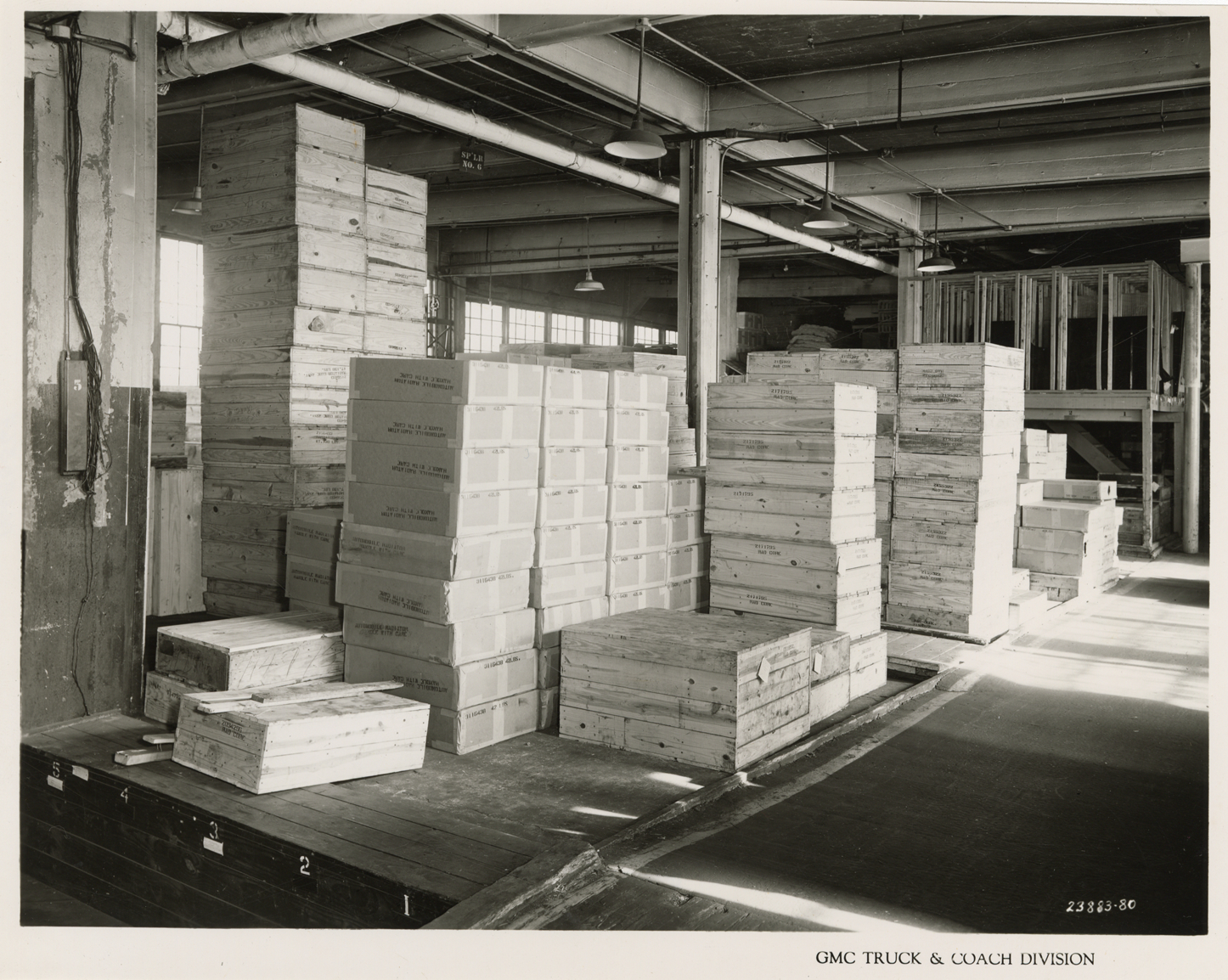 Wooden boxes in second floor storage, Service Division, Plant 1, GMC Truck & Coach Division factory