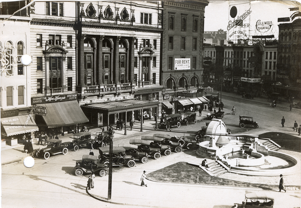 View of cars parked in front of the Detroit Opera House. Merrill fountain on right. Stamped on back: "Spooner & Wells, Inc., photographers, 1231 Woodward Ave., Detroit, Mich." Handwritten on back: "Photo taken for Speedway Country Club, ca. 1915."