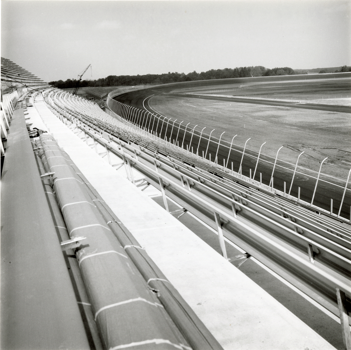 View of the racetrack for the Michigan International Speedway in Brooklyn, Michigan, during construction. Grandstand is visible on left. The Speedway was designed by Charles Moneypenny and built by developer Lawrence H. LoPatin.