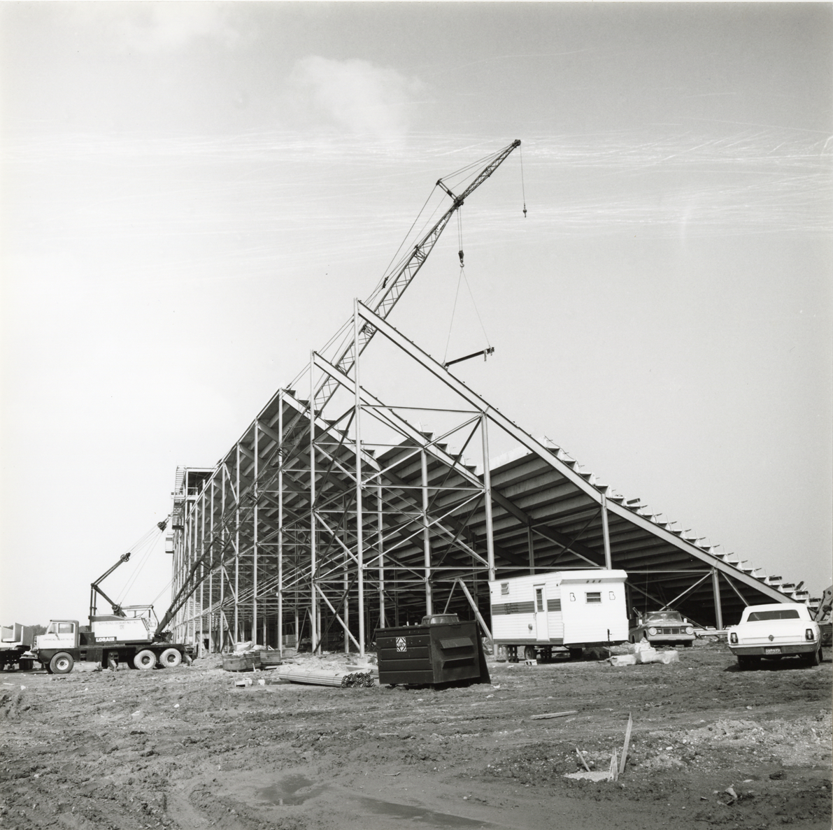 View of grandstand for the Michigan International Speedway in Brooklyn, Michigan, during construction. Crane on left; camper on right. The Speedway was designed by Charles Moneypenny and built by developer Lawrence H. LoPatin.