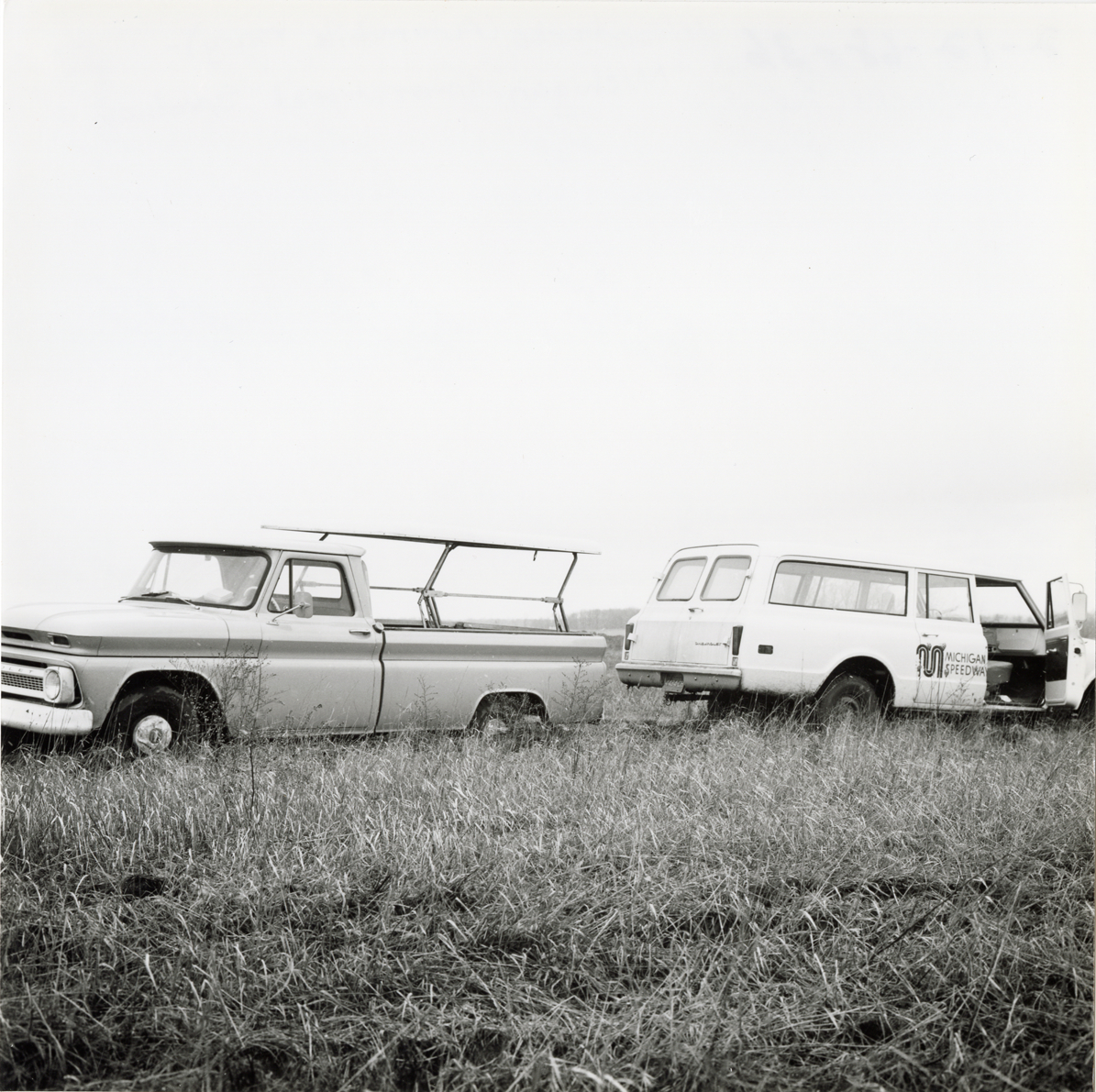 View of two Chevrolet trucks parked at the Michigan International Speedway in Brooklyn, Michigan, during construction. The Speedway was designed by Charles Moneypenny and built by developer Lawrence H. LoPatin.