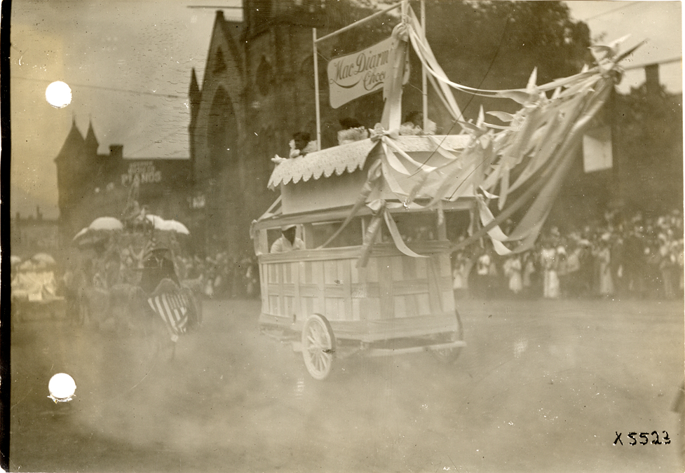 View of the MacDiarmid's chocolates float during the 1912 Cadillaqua parade. Stamped on back: "Spooner & Wells, Inc., photographers, 1231 Woodward Ave., Detroit, Mich., telephone North 1745." Handwritten on back: "Prize winner. Cadillaqua celebration, Detroit, 1912."