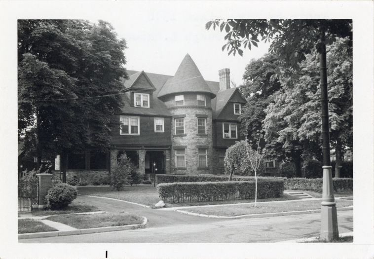 View of the Joseph L. Hudson residence, located on Boston Boulevard. Three-story brick house has turret and covered entry porch. Typed on back: "Photo by Dave Olson, 1970. Last home of Joseph L. Hudson, Boston Blvd."